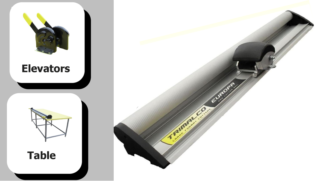 Europa, Trimalco’s large format cutting system comprises a number of interacting products which together offer a high degree of performance and accuracy at a price unmatched by any other. The cutting head, which is common to all Trimalco cutter rails, includes a magnetic blade magazine which accepts standard utility blades and standard scoring blades. A 45mm (1¾”) textile cutting wheel and holder is included as standard. A choice of two cutter rails is available. The unique lightweight, single extrusion design of the Europa offers an inbuilt rigidity which allows the cutter to span widths in excess of 5m. The Europa Pro, which outwardly looks identical, is made from two extrusions factory adjusted for increased accuracy