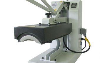 Conventional heat press featuring a basic frame and of manual actuation, developed for applying prints and effects onto Jeanswear. It is designed with a concave thermal platen measuring 210x450mm and allows for exchanging the thermal platen with a flat thermal platen measuring 350x450mm.